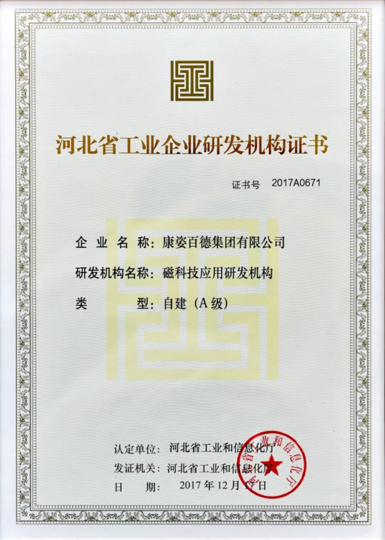 康姿百德在研發經費占比、在研項目數量、知識產權產出等方面均遠超河北省工業和信息化廳的基本要求,展現出系統化、規模化的研發實力。該榮譽充分說明了康姿百德在磁應用技術領域的領先地位,是對康姿百德在磁科技領域所做貢獻的認可。
